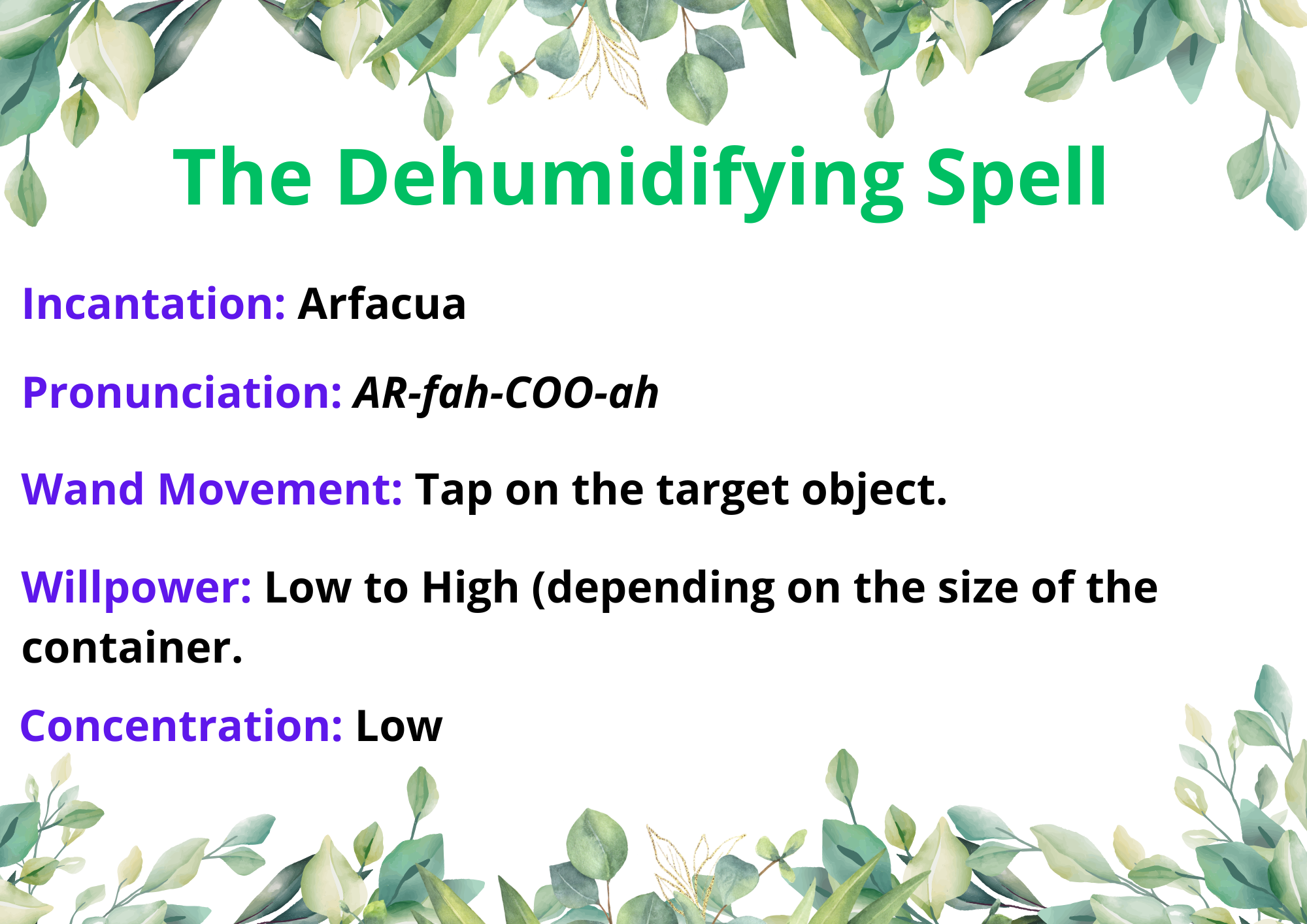 Magic, you wonderful tool! Many of the plants covered today require drying to tap into particular properties. If we were Muggles, there would be specific procedures and considerations for hand-drying each plant, and in some cases, we would have to wait an exceptionally long time for plants to be completely dry. However, as we are blessed with the powers of magic, we can have some instant gratification! The Dehumidifying Spell -- not to be confused with the Quick Drying Charm you’ll learn in your Third Year of Charms class -- will completely remove moisture from the air in the area you cast on. At your level, there are few safety concerns surrounding casting this on a large area, since you do not have the willpower sufficient to accidentally sap entire rooms of moisture and cause adverse effects on your classmates and yourself. However, this is something to be wary of in the future.