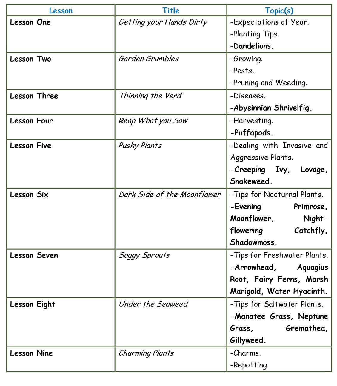 For the first four weeks, we’ll be taking a look at different key stages of plant development in each lesson, which we went over last year. As you can see from the syllabus below, the stages we will be looking at are planting, growing, pruning, and harvesting. It will be by no means an exhaustive list, but we will go over generalized tips and tricks that apply to multiple plants, and plants in specific categories. However, owing to the stunning variety of magical (and non-magical) plants, there is always something new to learn, and in this case, many plants that have specific needs (whether for repotting, pruning, or the rest of it) will not be covered. While we cannot possibly cover every single plant, I will endeavor to cover at least one example for every concept and not only go through the process as it specifically applies to that plant, but also give a general look at the plant so you can add one more herb to your repertoire!