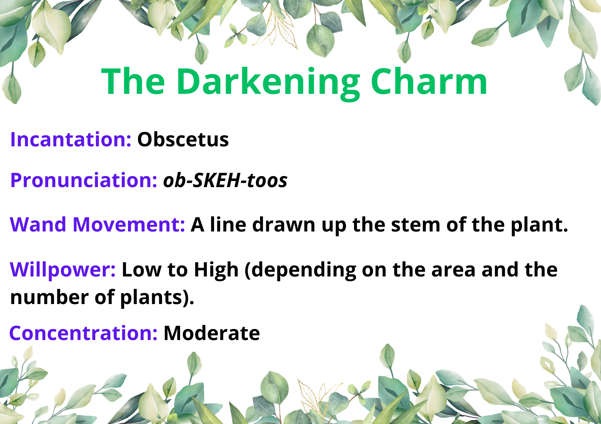 Once you have your soil sorted, you must know how much sun your planting area gets. In greenhouses, this can be a real issue. Plants that require shade or partial shade may be blasted with too much sunlight due to the greenhouse’s light-channeling properties. In this situation, you can either plant your herbs in a place where they will be shaded by other, taller specimens, or you can use a handy charm to help block the sun from certain areas: the Darkening Charm. This spell can be a bit tricky to get right, as the concentration is quite a bit higher than the other charms you have learned so far in this class, but you can experiment until you get it. Additionally, the larger the plant, or the more plants you attempt to apply this spell to, the higher the willpower required.1 For this reason, I highly recommend starting by enchanting a single plant at a time. This charm needs to envelop the desired plant in order to imperceptibly darken the air around it as though tinted. This won’t be visible to the naked eye, but will function as a sort of two-way mirror. As you become more adept at this charm and magic in general, you may also be able to set the spell to snuff out the light only at specific times, but I would not be surprised if it took you until your Fourth Year to fully get the hang of that particular aspect. One word of warning: be mindful that if the spell backfires, your plant could be fried to a crisp as though held under a magnifying glass. You can find the spell’s details below: