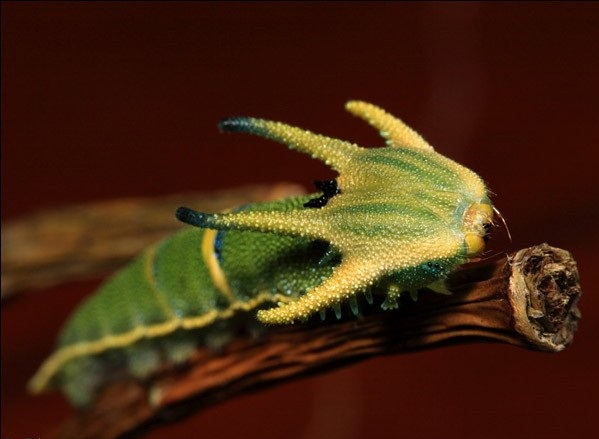 Also commonly referred to as a Chlorophillar, the Botany Butterfly is the first magical insect we are investigating today. This pest is a concern when growing any plants that fit our definition of magical as defined in Year One, Lesson Four. This insect is problematic only in its larval form (as a caterpillar). As you may know, caterpillars must stock up on food in order to have enough energy for their transformation into a butterfly. Typically, this results in many chewed leaves, a fat caterpillar, and an eventual chrysalis. However, this insect’s transformation is quite different. It stays in its chrysalis for an inordinately long time -- approximately three months -- and during this time harnesses the power of photosynthesis in order to make its food. It is uncertain how and why this first occurred, but researchers assume this development is due to a reaction between the magic and photosynthesizing properties of magical plants, and potentially the genetic structure of this insect, which ultimately imbued the Chlorophillars with the temporary ability to use the energy from the sun. The final product is quite spectacular, resulting in butterflies with wings that look like flower petals or leaves, which bear coloration and markings very similar to the plant that they consumed the most during their time in their larval form.