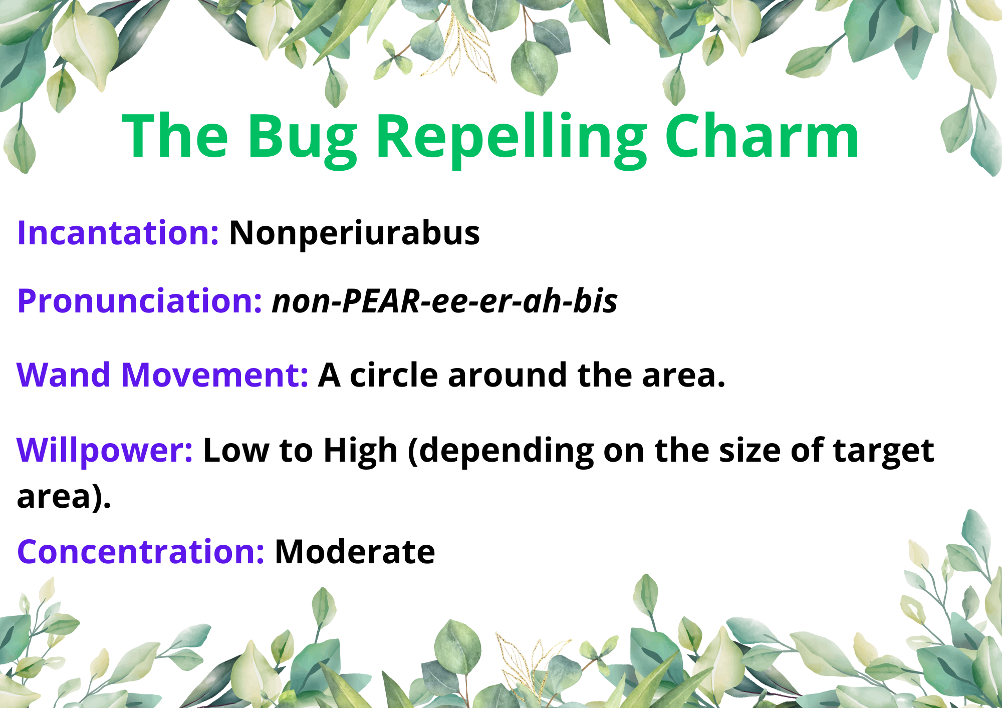 Now that we have covered some specific nuisances, I want to add one more spell to your herbological toolbelt. This spell prevents a plant from attracting the attention of bugs in the first place, though it is not 100% foolproof. The spell creates a sort of invisible field around the plant, hiding its appearance and scent from those insects that might want it for a snack. For a comparison, it is almost like you are giving your plants a little invisibility cloak. There are, of course, some limitations. You’ll find it quite difficult to enchant your entire plot -- the willpower required increases significantly with the size of area enchanted -- so you may wish to apply it to each cluster of plants separately. Additionally, the charm will eventually dissipate, so you will need to recast. Beginners will likely need to do so at the turn of each season, though by the end of the season, the protection will be fading slightly and your plant may be only partially obscured from insects’ view.