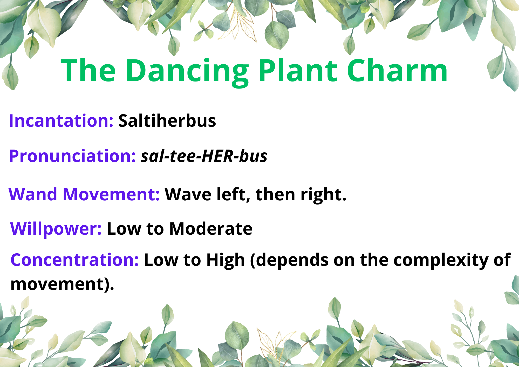 Of course, if you want a real performance, you’ll need the plant to dance as well. That’s where the Dancing Plant Charm comes in. This charm will make the plant move in a choreographed way. Keep in mind, of course, that making your wisteria waltz is going to be beyond you at this point. Movements should be very limited, perhaps a slight swaying back and forth in time with the rhythm. To cast the Dancing Plant Charm, use the incantation Saltiherbus (sal-tee-HER-bus) and wave your wand left then right so that it ends pointing toward the plant. You should focus on the plant and use low to moderate willpower, depending on the size of the plant. Additionally, concentrate on the rhythm and motions you wish your plant to make, along with any delays for pauses in the singing. This spell will also last until the magic wears out or you cancel it with the Effect-Cancelling Charm. Note that the two spells are safe to cast in combination.
