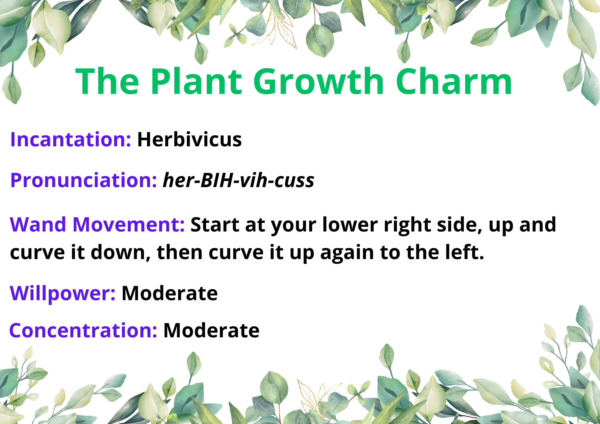 Hello, everyone, and welcome to your last lesson in Herbology this year! Today we are going to look at some charms and plants. After all, aren’t plants just charming? We will first be covering a few spells that are definitely on a need-to-know list for any herbologist. Then, we will have a brief guest appearance to show you some plant-related charms that are just for fun. Finally, we will wrap up class and the year with a brief review.