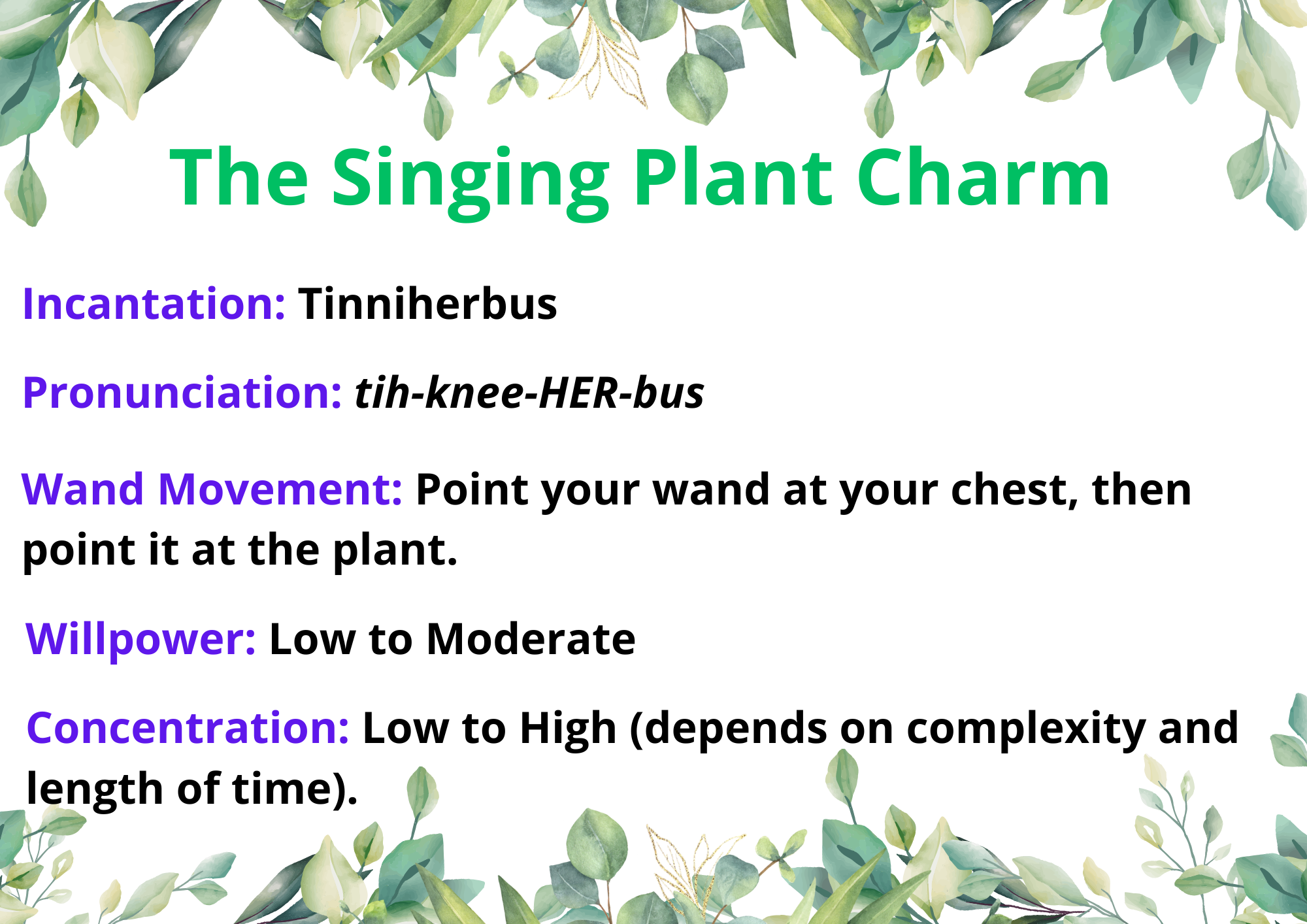 In order to cast the Singing Plant Charm, you must speak the incantation Tinniherbus (tih-knee-HER-bus) while flicking your wand in a quick half-circle to the left, starting with it pointing at your chest (be careful!) and ending with it pointing at the plant. You should focus on the plant, as well as the tune of the song itself while you cast the charm, and you should use low to moderate willpower to determine the volume – too much willpower and you might hurt the plant. If you are intimately familiar with the song, simply bringing it to mind may be sufficient, but actually humming it under your breath may be useful as well. If you are familiar enough -- and can focus well -- you can concentrate on a series of songs to form a ‘playlist’ of sorts. The song or songs will continue looping, with some delay if you include that in your visualization, until the magic wears off or is ended with the Effect-Cancelling Charm, Finite, which you have covered in Charms this year.