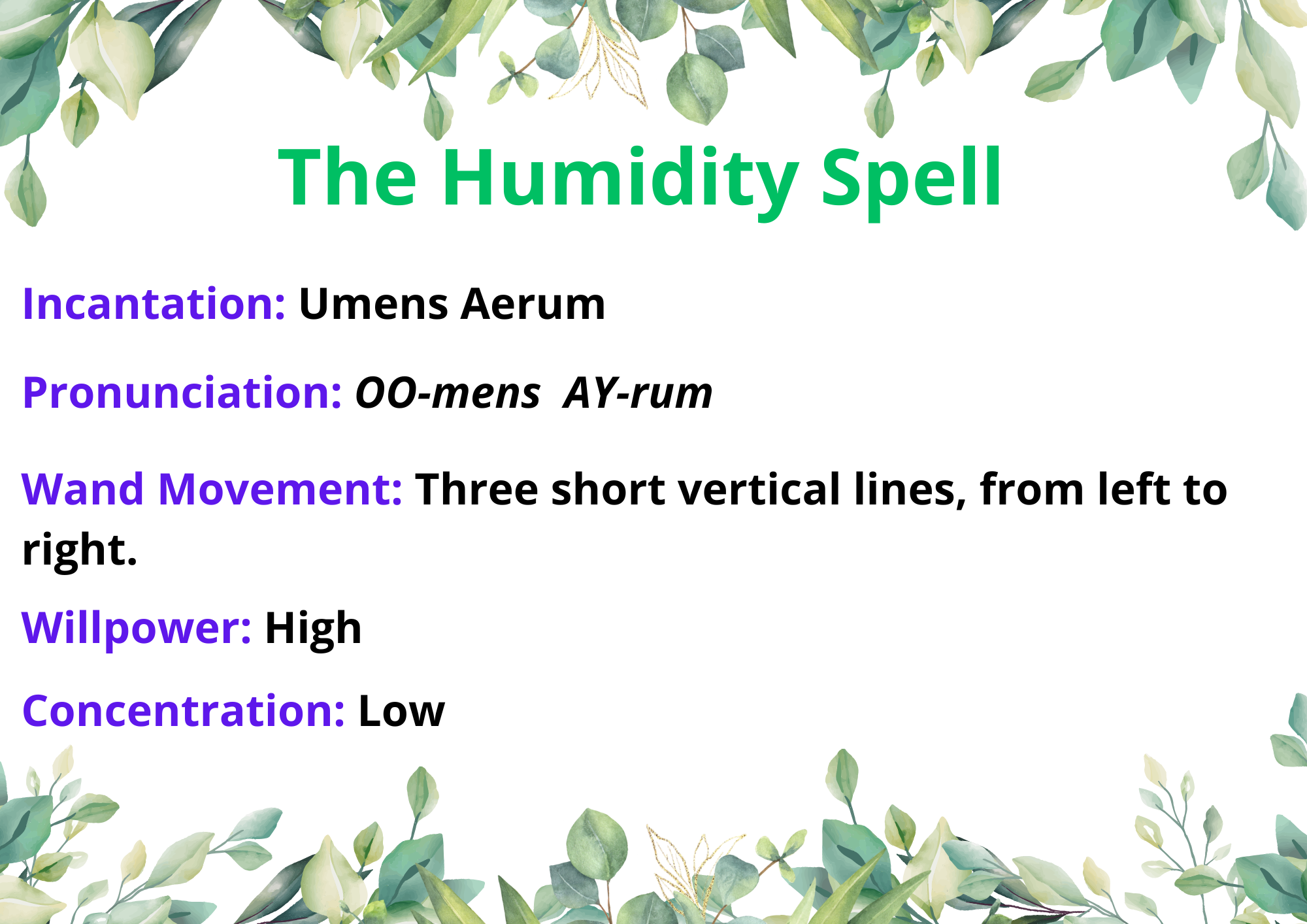 As you will have guessed, these plants require significant care in order to mimic their natural surroundings, though they grow voraciously in the wilds of the Philippine Islands. Firstly, just like any other vine, the emerald creeper usually grows on something else, so some type of structure must be provided for it to latch onto. As for its planting needs, it requires slightly acidic soil (with a pH of roughly 6.1 to 6.5), full sun, and frequent watering to keep the soil moist, but not waterlogged. In addition to these needs, the plant must be kept in an environment of at least 15 degrees Celsius (or 59 degrees Fahrenheit) and high humidity. For this, the Humidity Spell is often used, though it requires the plant to be kept separate from other plants for which humidity is a problem. Finally, it is best to fertilize the soil once or twice a month with either dragon dung or mooncalf dung, depending on how the plant reacts.