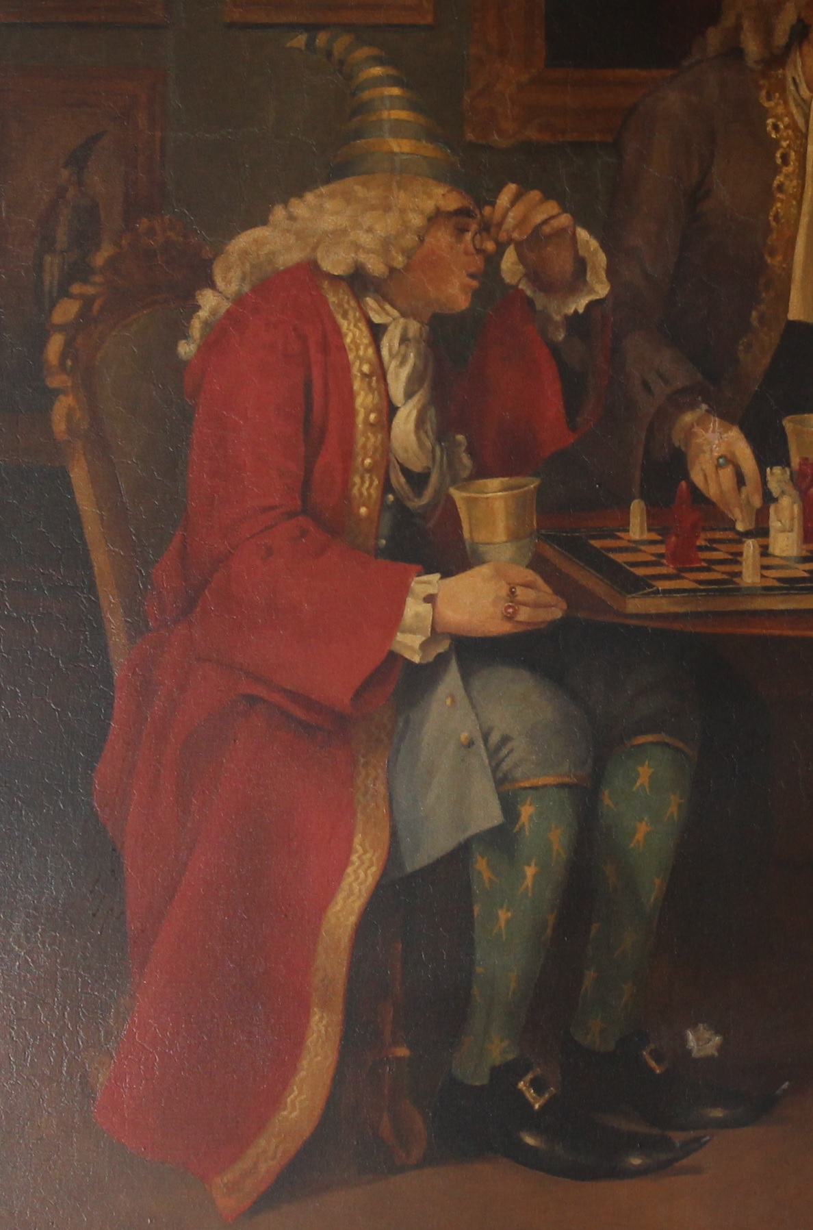 This portrait of wizards playing wizard chess hangs in the Gryffindor Tower. All four of the players present within the painting were Gryffindor Heads of House during a twenty-five year period from 1762 to 1787. This portrait is a depiction of these close colleagues gathering and playing quite possibly the longest game of wizard chess. This gathering took place in Hogwarts School of Witchcraft and Wizardry when the past three Heads of Gryffindor House (Muldoon Cragg, Podric Piles, and Uric Oapley) met up with the current Head of House, Tobias Stump, for a reunion. The reunion began with Stump giving the past heads a general tour around the castle on what had changed since their departure. At some point they returned to Gryffindor Tower and during their banter, Piles spotted a wizard chessboard and suggested playing a round of the game. Oapley, who was known to be quite competitive, agreed and sat down to play with Piles. Stump watched over the game out of interest and halfway officiated it, while Cragg didn’t necessarily care for the game at all. Instead of participating, Cragg is depicted standing against a windowsill, reading a book. The past professors can still be seen playing their eternal game of wizard chess. Piles and Oapley are either deep in thought or bickering with each other as Stump attempts to dissolve the situation, while Cragg continues reading and stays out of it.